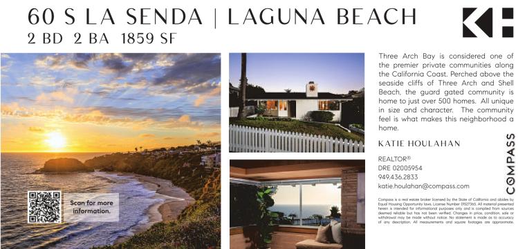 6 0 S L A S E N DA | L AG UNA B E AC H 2 BD 2 BA 1859 SF Three Arch Bay is considered one of the premier private communities along the California Coast. Perched above the seaside cliffs of Three Arch and Shell Beach, the guard gated community is home to just over 500 homes. All unique in size and character. The community feel is what makes this neighborhood a home. KATIE HOULAHAN REALTOR ® DRE 02005954 949.436.2833 katie.houlahan@compass.com Scan for more information. Compass is areal estate broker licensed bythe State ofCalifornia and abides by Equal Housing Opportunity laws. License Number 01527365. All material presented herein is intended for informational purposes only and is compiled from sources deemed reliable but has not been verified. Changes in price, condition, sale or withdrawal may be made without notice. No statement is made as to accuracy of any description. All measurements and square footages are approximate.