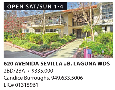 620 AVENIDASEVILLA#B, LAGUNA WDS 2BD/2BA • $335,000 CandiceBurroughs,949.633.5006 LIC# 01315961