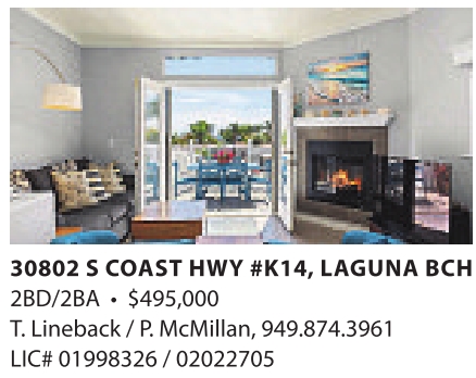 30802 S COAST HWY #K14, LAGUNA BCH 2BD/2BA • $495,000 T. Lineback/ P. McMillan, 949.874.3961 LIC# 01998326 / 02022705