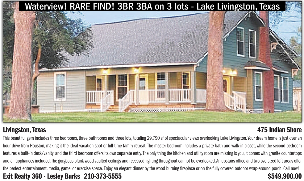 Waterview! RARE FIND! 3BR 3BA on 3 lots - Lake Livingston, Texas Livingston,Texas 475 Indian Shore This beautiful gem includes three bedrooms,three bathrooms and three lots,totaling 29,790 sf of spectacular views overlooking Lake Livingston.Your dream home is just over an hour drive from Houston, making itthe ideal vacation spot or full-time family retreat.The master bedroom includes aprivate bath and walk-in closet, while the second bedroom features abuilt-in desk/vanity,and the third bedroom offers its own separate entry.The only thing the kitchen and utility room are missing isyou,it comes with granite countertops and all appliances included.The gorgeous plank wood vaulted ceilings and recessed lighting throughout cannot be overlooked.An upstairs office and two oversized loft areas offer the perfect entertainment, media, game, or exercise space. Enjoy an elegant dinner by the wood burning fireplace or on the fully covered outdoor wrap-around porch. Call now! Exit Realty 360-Lesley Burks 210-373-5555 $549,900.00