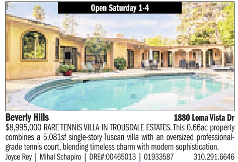 Open Saturday 1-4 Beverly Hills 1880 LomaVista Dr $8,995,000 RARE TENNIS VILLA IN TROUSDALE ESTATES.This 0.66ac property combines a 5,081sf single-story Tuscan villa with an oversized professionalgrade tennis court, blending timeless charm with modern sophistication. Joyce Rey | Mihal Schapiro | DRE#:00465013 | 01933587 310.291.6646