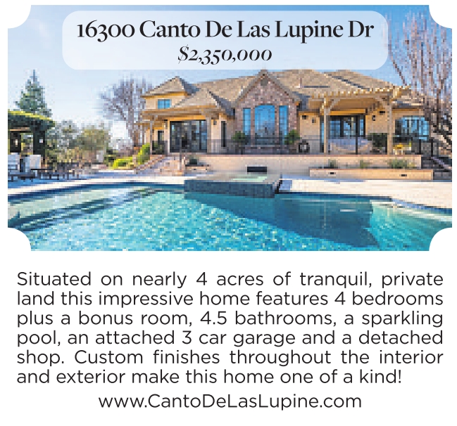 16300 Canto De Las Lupine Dr $2,350,000 Situated on nearly 4 acres of tranquil, private land this impressive home features 4 bedrooms plus a bonus room, 4.5 bathrooms, a sparkling pool, an attached 3 car garage and a detached shop. Custom finishes throughout the interior and exterior make this home one of a kind! www.CantoDeLasLupine.com