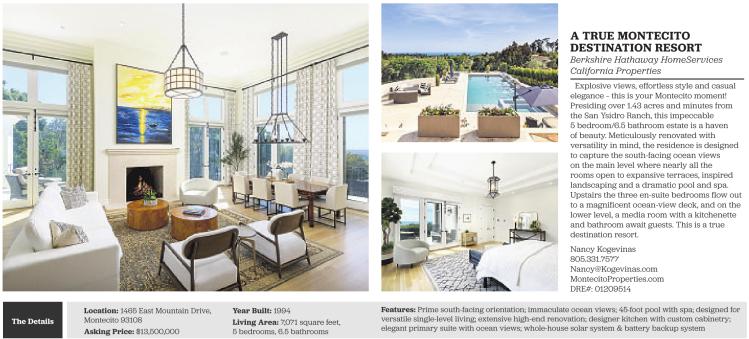 The Details Location: 1465 East Mountain Drive, Montecito 93108 Asking Price: $13,500,000 Year Built: 1994 Living Area: 7,071 square feet, 5 bedrooms, 6.5 bathrooms A TRUE MONTECITO DESTINATION RESORT Berkshire Hathaway HomeServices California Properties Explosive views, effortless style and casual elegance – this is your Montecito moment! Presiding over 1.43 acres and minutes from the San Ysidro Ranch, this impeccable 5 bedroom/6.5 bathroom estate is a haven of beauty. Meticulously renovated with versatility in mind, the residence is designed to capture the south-facing ocean views on the main level where nearly all the rooms open to expansive terraces, inspired landscaping and a dramatic pool and spa. Upstairs the three en-suite bedrooms flow out to a magnificent ocean-view deck, and on the lower level, a media room with a kitchenette and bathroom await guests. This is a true destination resort. Nancy Kogevinas 805.331.7577 Nancy@Kogevinas.com MontecitoProperties.com DRE#: 01209514 Features: Prime south-facing orientation; immaculate ocean views; 45-foot pool with spa; designed for versatile single-level living; extensive high-end renovation; designer kitchen with custom cabinetry; elegant primary suite with ocean views; whole-house solar system & battery backup system See also