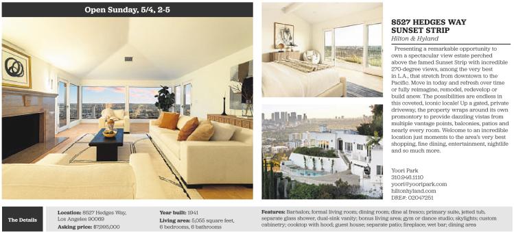 The Details Open Sunday, 5/4, 2-5 Location: 8527 Hedges Way, Los Angeles 90069 Asking price: $7,995,000 Year built: 1941 Living area: 5,055 square feet, 6 bedrooms, 6 bathrooms 8527 HEDGES WAY SUNSET STRIP Hilton & Hyland Presenting a remarkable opportunity to own a spectacular view estate perched above the famed Sunset Strip with incredible 270-degree views, among the very best in L.A., that stretch from downtown to the Pacific. Move in today and refresh over time or fully reimagine, remodel, redevelop or build anew. The possibilities are endless in this coveted, iconic locale! Up a gated, private driveway, the property wraps around its own promontory to provide dazzling vistas from multiple vantage points, balconies, patios and nearly every room. Welcome to an incredible location just moments to the area’s very best shopping, fine dining, entertainment, nightlife and so much more. Yoori Park 310.946.1110 yoori@yooripark.com hiltonhyland.com DRE#: 02047251 Features: Bar/salon; formal living room; dining room; dine al fresco; primary suite, jetted tub, separate glass shower, dual-sink vanity; bonus living area; gym or dance studio; skylights; custom cabinetry; cooktop with hood; guest house; separate patio; fireplace; wet bar; dining area See also