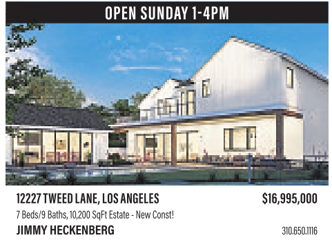 yes OPEN SUNDAY 1-4PM 12227TWEEDLANE,LOSANGELES $16,995,000 7Beds/9Baths,10,200SqFtEstate-NewConst! JIMMY HECKENBERG 310.650.1116 See also