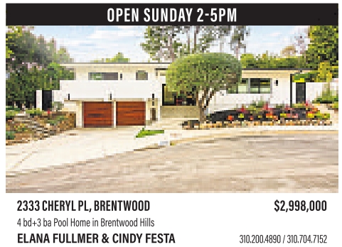 yes OPEN SUNDAY 2-5PM 2333CHERYLPL,BRENTWOOD $2,998,000 4bd+3baPoolHomeinBrentwood Hills ELANAFULLMER&CINDYFESTA 310.200.4890 /310.704.7152 See also