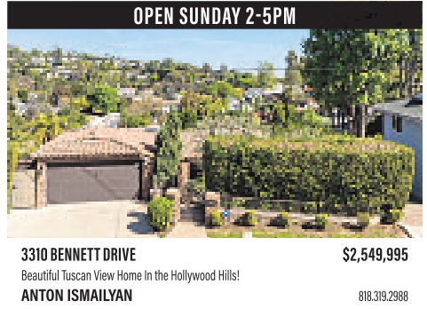 yes OPEN SUNDAY 2-5PM 3310BENNETTDRIVE $2,549,995 BeautifulTuscanViewHomeInthe HollywoodHills! ANTONISMAILYAN 818.319.2988 See also