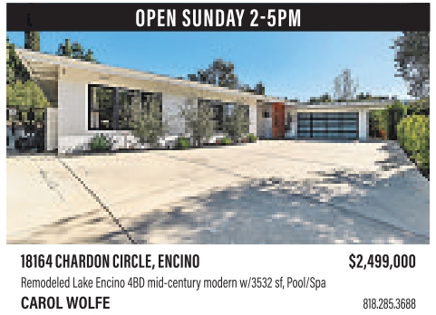 yes OPEN SUNDAY 2-5PM 18164CHARDONCIRCLE,ENCINO $2,499,000 Remodeled Lake Encino 4BDmid-century modernw/3532sf, Pool/Spa CAROLWOLFE 818.285.3688 See also