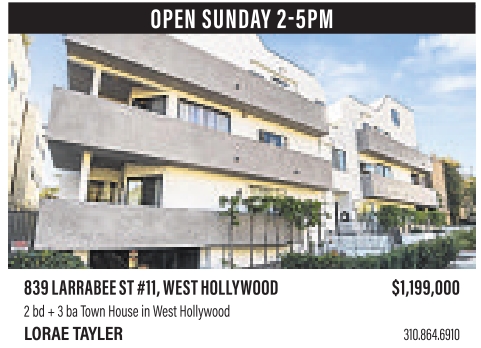 yes OPEN SUNDAY 2-5PM 839LARRABEEST#11,WESTHOLLYWOOD $1,199,000 2bd+3ba Town HouseinWestHollywood LORAETAYLER 310.864.6910 See also