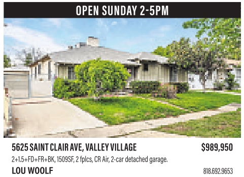 yes OPEN SUNDAY 2-5PM 5625SAINTCLAIR AVE,VALLEYVILLAGE $989,950 2+1.5+FD+FR+BK, 1509SF, 2fplcs, CR Air, 2-cardetachedgarage. LOUWOOLF 818.692.9653 See also