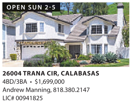 OPEN SUN 2-5 26004 TRANA CIR, CALABASAS 4BD/3BA • $1,699,000 Andrew Manning,818.380.2147 LIC# 00941825 See also