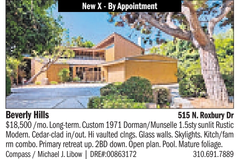 515 N. Roxbury Dr $18,500 /mo.Long-term. Custom 1971 Dorman/Munselle 1.5sty sunlit Rustic Modern. Cedar-clad in/out. Hi vaulted clngs. Glass walls. Skylights. Kitch/fam rm combo. Primary retreat up. 2BD down. Open plan. Pool. Mature foliage.