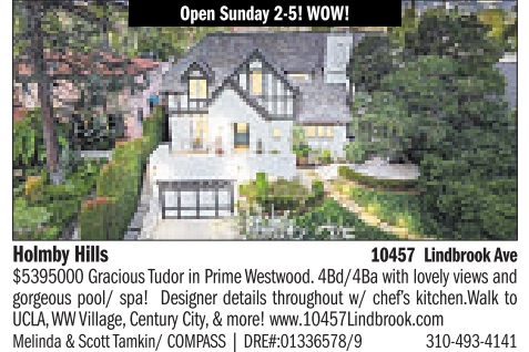 Open Sunday 2-5! WOW! Holmby Hills 10457 LindbrookAve $5395000 Gracious Tudor in Prime Westwood. 4Bd/4Ba with lovely views and gorgeous pool/ spa! Designer details throughout w/ chef’s kitchen.Walk to UCLA,WWVillage, Century City, & more! www.10457Lindbrook.com Melinda & ScottTamkin/ COMPASS | DRE#:01336578/9 310-493-4141 See also