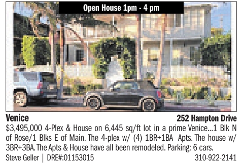 252 Hampton Drive $3,495,000 4-Plex & House on 6,445 sq/ft lot in a prime Venice...1 Blk N of Rose/1 Blks E of Main. The 4-plex w/ (4) 1BR+1BA Apts. The house w/ 3BR+3BA.TheApts & House have all been remodeled. Parking: 6 cars.