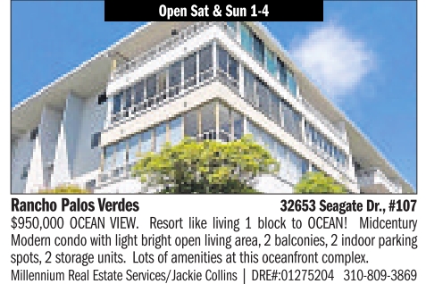 Rancho Palos Verdes 32653 Seagate Dr., #107 $950,000 OCEAN VIEW. Resort like living 1 block to OCEAN! Midcentury Modern condo with light bright open living area, 2 balconies, 2 indoor parking spots, 2 storage units. Lots of amenities at this oceanfront complex.