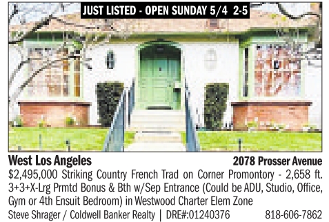 2078 ProsserAvenue $2,495,000 Striking Country French Trad on Corner Promontory - 2,658 ft. 3+3+X-Lrg Prmtd Bonus & Bth w/Sep Entrance (Could be ADU, Studio, Office, Gym or 4th Ensuit Bedroom) inWestwood Charter Elem Zone