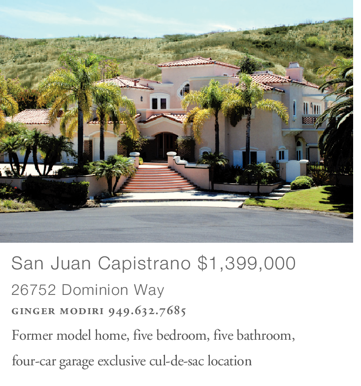 San Juan Capistrano $1,399,000 26752 Dominion Way ginger modiri 949.632.7685 Former model home, five bedroom, five bathroom, four-car garage exclusive cul-de-sac location