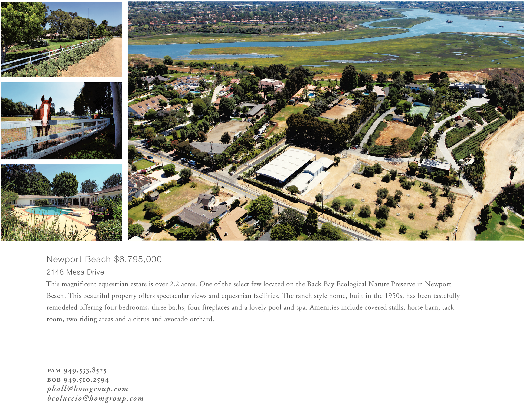 Newport Beach $6,795,000 2148 Mesa Drive This magnificent equestrian estate is over 2.2 acres. One of the select few located on the Back Bay Ecological Nature Preserve in Newport Beach. This beautiful property offers spectacular views and equestrian facilities. The ranch style home, built in the 1950s, has been tastefully remodeled offering four bedrooms, three baths, four fireplaces and a lovely pool and spa. Amenities include covered stalls, horse barn, tack room, two riding areas and a citrus and avocado orchard. pam 949.533.8525 bob 949.510.2594 pball@homgroup.com bcoluccio@homgroup.com