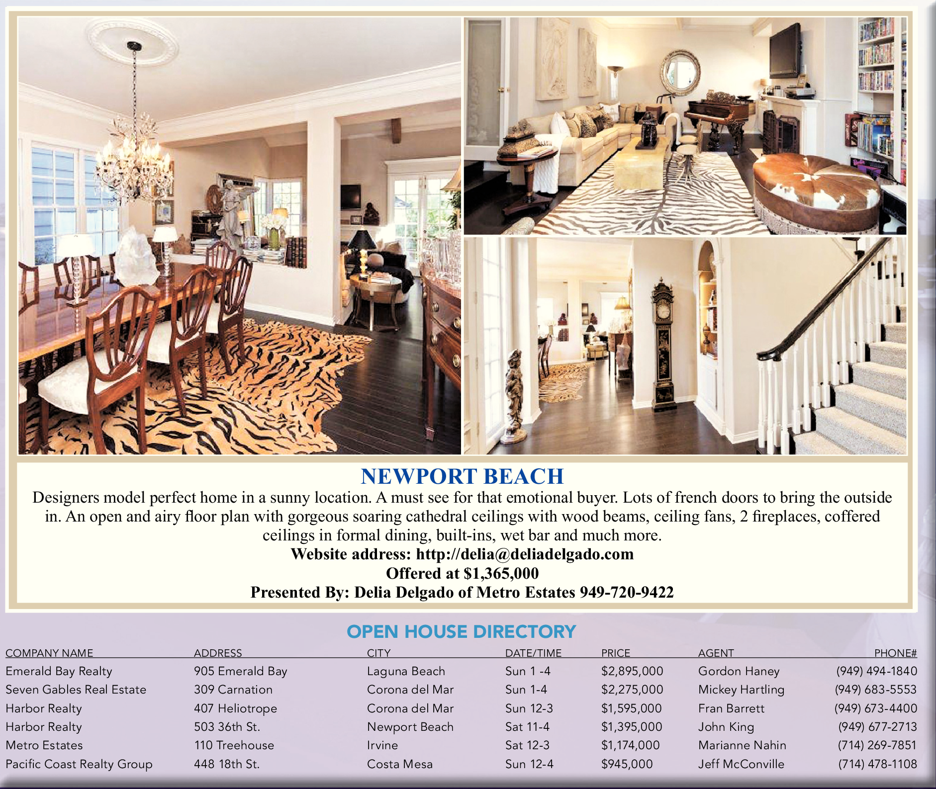 COMPANY NAME ADDRESS CITY DATE/TIME PRICE AGENT PHONE# Emerald Bay Realty 905 Emerald Bay Laguna Beach Sun 1 -4 $2,895,000 Gordon Haney (949) 494-1840 Seven Gables Real Estate 309 Carnation Corona del Mar Sun 1-4 $2,275,000 Mickey Hartling (949) 683-5553 Harbor Realty 407 Heliotrope Corona del Mar Sun 12-3 $1,595,000 Fran Barrett (949) 673-4400 Harbor Realty 503 36th St. Newport Beach Sat 11-4 $1,395,000 John King (949) 677-2713 Metro Estates 110 Treehouse Irvine Sat 12-3 $1,174,000 Marianne Nahin (714) 269-7851 Pacific Coast Realty Group 448 18th St. Costa Mesa Sun 12-4 $945,000 Jeff McConville (714) 478-1108