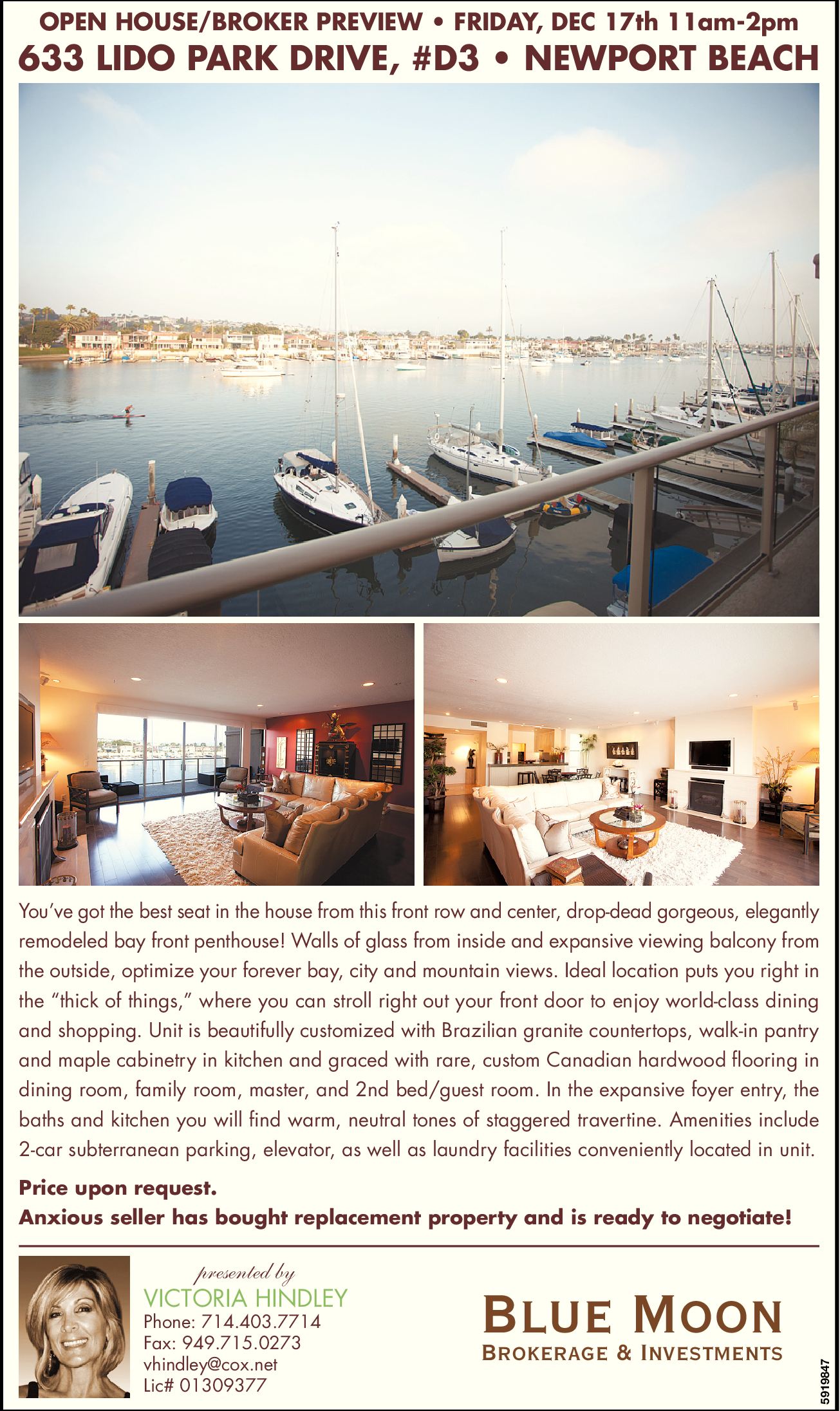 OPEN HOUSE/BROKER PREVIEW • FRIDAY, DEC 17th 11am-2pm 633 LIDO PARK DRIVE, #D3 • NEWPORT BEACH You’ve got the best seat in the house from this front row and center, drop-dead gorgeous, elegantly remodeled bay front penthouse! Walls of glass from inside and expansive viewing balcony from the outside, optimize your forever bay, city and mountain views. Ideal location puts you right in the “thick of things,” where you can stroll right out your front door to enjoy world-class dining and shopping. Unit is beautifully customized with Brazilian granite countertops, walk-in pantry and maple cabinetry in kitchen and graced with rare, custom Canadian hardwood flooring in dining room, family room, master, and 2nd bed/guest room. In the expansive foyer entry, the baths and kitchen you will find warm, neutral tones of staggered travertine. Amenities include 2-car subterranean parking, elevator, as well as laundry facilities conveniently located in unit. Price upon request. Anxious seller has bought replacement property and is ready to negotiate! presented by VICTORIA HINDLEY Phone: 714.403.7714 Fax: 949.715.0273 vhindley@cox.net Lic# 01309377 Blue Moon Brokerage & Investments