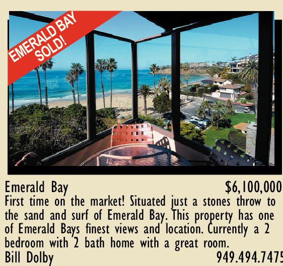 Emerald Bay $6,100,000 First time on the market! Situated just a stones throw to the sand and surf of Emerald Bay. This property p has one of Emerald Bays finest views and location. Currently a 2 bedroom with 2 bath home with a great room. Bill Dolby 949.494.7475