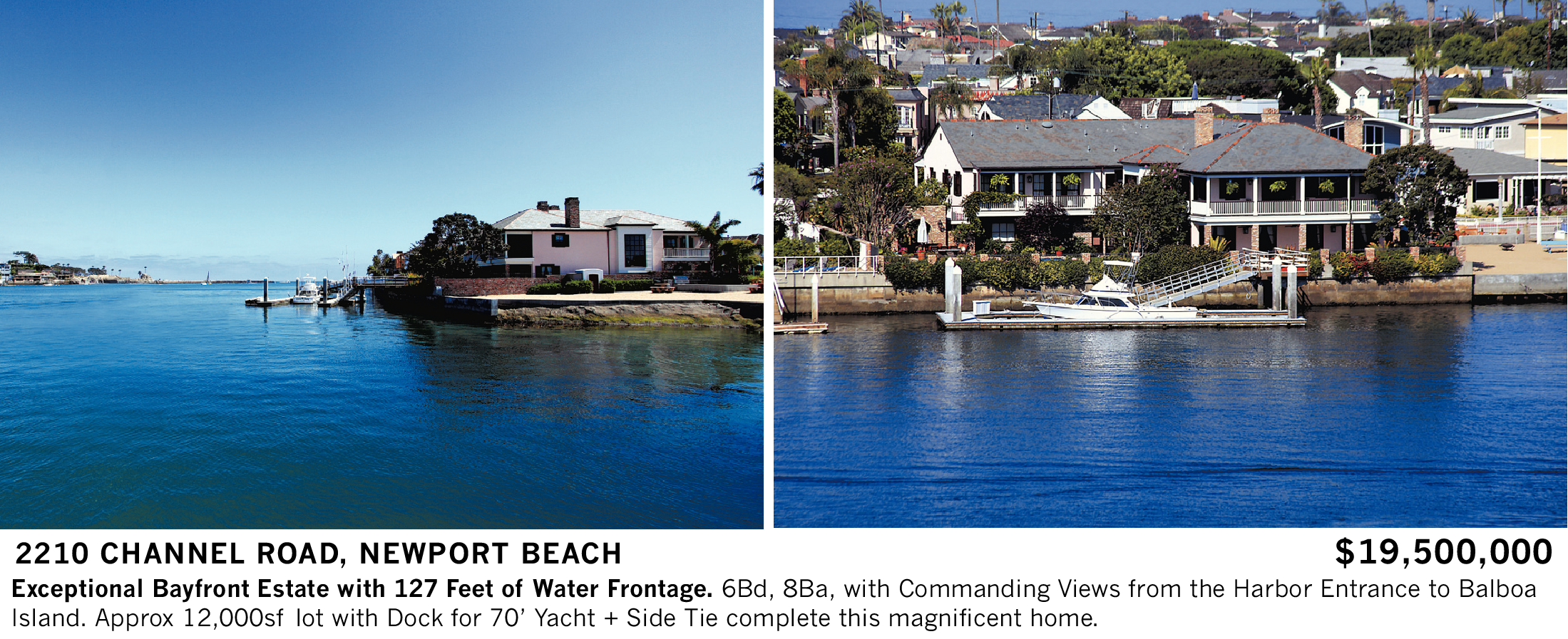 2210 CHANNEL ROAD, NEWPORT BEACH $19,500,000 Exceptional Bayfront Estate with 127 Feet of Water Frontage. 6Bd, 8Ba, with Commanding Views from the Harbor Entrance to Balboa Island. Approx 12,000sf lot with Dock for 70’ Yacht + Side Tie complete this magnificent home.