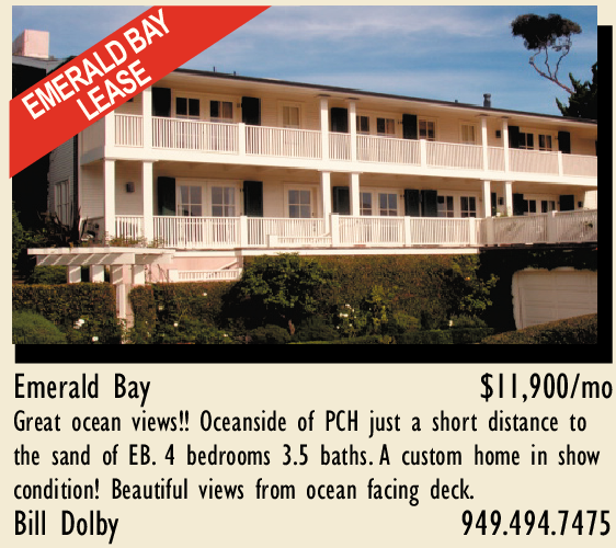 Emerald Bay $11,900/mo Great ocean views!! Oceanside of PCH just a short distance to the sand of EB. 4 bedrooms 3.5 baths. A custom home in show condition! Beautiful views from ocean facing deck. Bill Dolby 949.494.7475