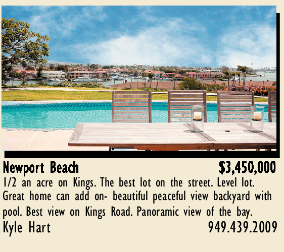 1/2 an acre on Kings. The best lot on the street. Level lot. Great home can add on- beautiful peaceful view backyard with pool. Best view on Kings Road. Panoramic view of the bay. Kyle Hart 949.439.2009