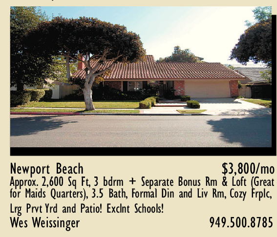 Newport Beach $3,800/mo Approx. 2,600 Sq Ft, 3 bdrm + Separate Bonus Rm & Loft (Great for Maids Quarters), 3.5 Bath, Formal Din and Liv Rm, Cozy Frplc, Lrg Prvt Yrd and Patio! Exclnt Schools! Wes Weissinger 949.500.8785