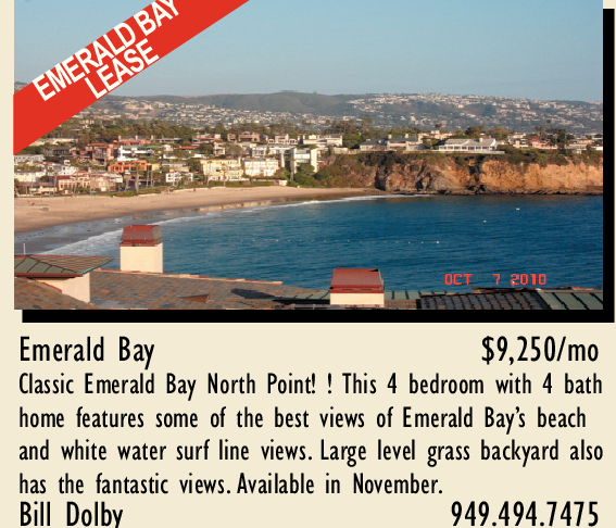 Emerald Bay $9,250/mo Classic Emerald Bay North Point! ! This 4 bedroom with 4 bath home features some of the best views of Emerald Bay’s beach and white water surf line views. Large level grass backyard also has the fantastic views. Available in November. Bill Dolby 949.494.7475