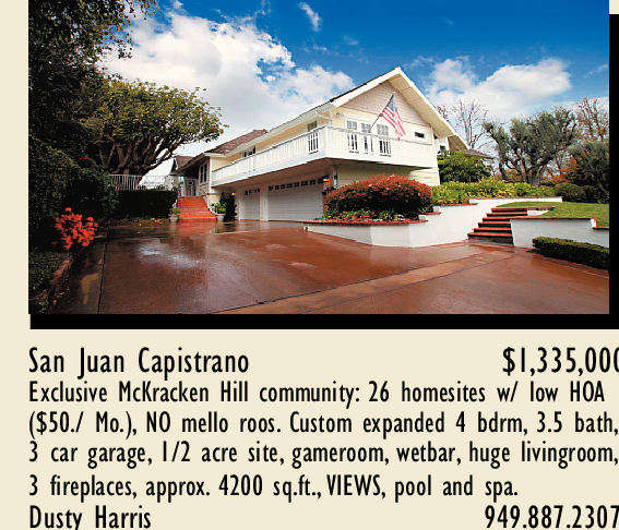 San Juan Capistrano $1,335,000 Exclusive McKracken Hill community: 26 homesites w/ low HOA ($50./ Mo.), NO mello roos. Custom expanded 4 bdrm, 3.5 bath, 3 car garage, 1/2 acre site, gameroom, wetbar, huge livingroom, 3 fireplaces, approx. 4200 sq.ft., VIEWS, pool and spa. Dusty Harris 949.887.2307