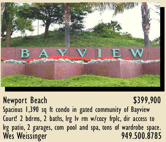 Newport Beach $399,900 Spacious 1,390 sq ft condo in gated community of Bayview Court! 2 bdrms, 2 baths, lrg lv rm w/cozy frplc, dir access to lrg patio, 2 garages, com pool and spa, tons of wardrobe space. Wes Weissinger 949.500.8785