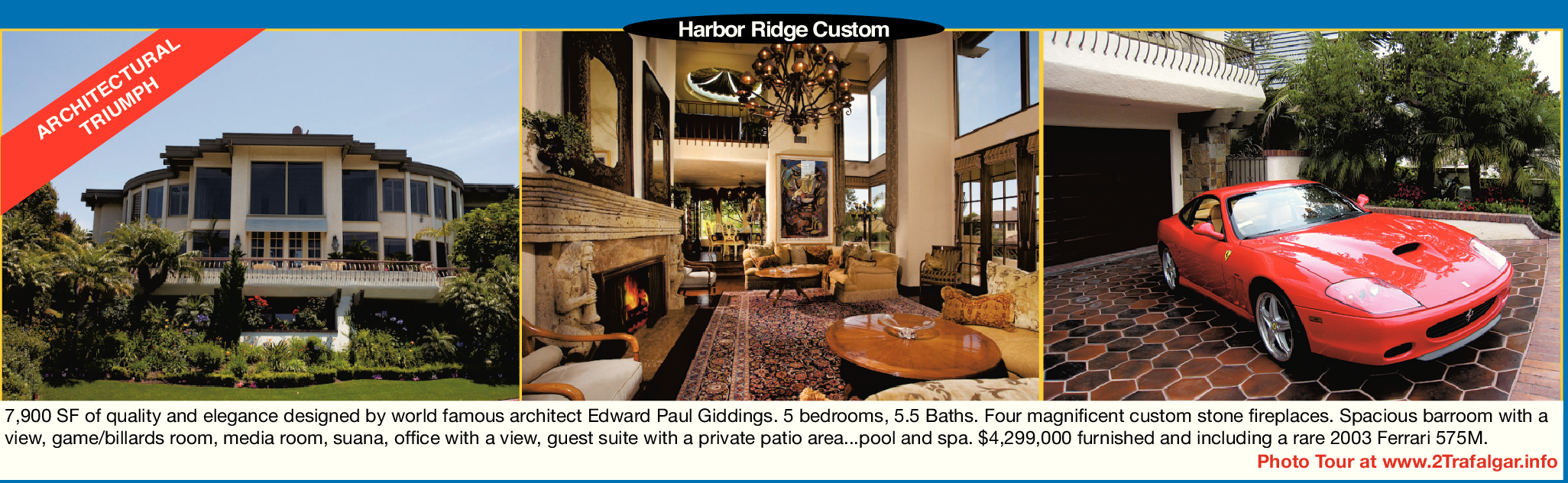 7,900 SF of quality and elegance designed by world famous architect Edward Paul Giddings. 5 bedrooms, 5.5 Baths. Four magnificent custom stone fireplaces. Spacious barroom with a view, game/billards room, media room, suana, office with a view, guest suite with a private patio area...pool and spa. $4,299,000 furnished and including a rare 2003 Ferrari 575M.
