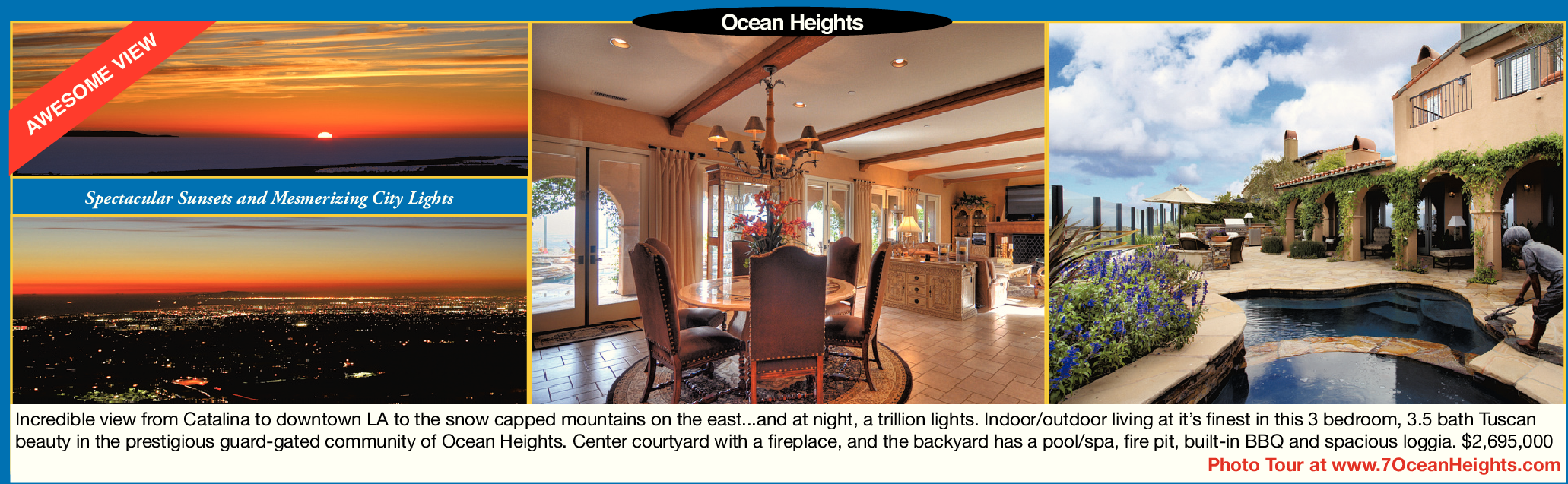 Spectacular Sunsets and Mesmerizing City Lights Incredible view from Catalina to downtown LA to the snow capped mountains on the east...and at night, a trillion lights. Indoor/outdoor living at it’s finest in this 3 bedroom, 3.5 bath Tuscan beauty in the prestigious guard-gated community of Ocean Heights. Center courtyard with a fireplace, and the backyard has a pool/spa, fire pit, built-in BBQ and spacious loggia. $2,695,000 Photo Tour at www.7OceanHeights.com Ocean Heights