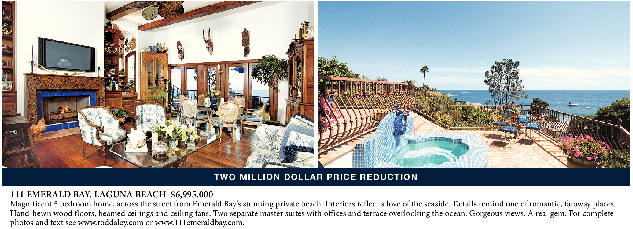 111 EMERALD BAY, LAGUNA BEACH $6,995,000 Magnificent 5 bedroom home, across the street from Emerald Bay’s stunning private beach. Interiors reflect a love of the seaside. Details remind one of romantic, faraway places. Hand-hewn wood floors, beamed ceilings and ceiling fans. Two separate master suites with offices and terrace overlooking the ocean. Gorgeous views. A real gem. For complete photos and text see www.roddaley.com or www.111emeraldbay.com. TWO MILLION DOLLAR PRICE REDUCTION