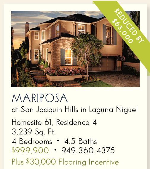 at San Joaquin Hills in Laguna Niguel Homesite 61, Residence 4 3,239 Sq. Ft. 4 Bedrooms • 4.5 Baths $999,900 • 949.360.4375 Plus $30,000 Flooring Incentive