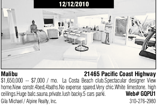 Malibu 21465 Pacific Coast Highway $1,650,000 -- $7,000 / mo. La Costa Beach club.Spectacular designer View home.New constr.4bed,4baths.No expense spared.Very chic.White limestone. high ceilings.Huge balc.sauna.private.lush backy.5 cars parki. Web# GQPU1 Gila Michael / Alpine Realty, Inc. 310-276-2980 12/12/2010