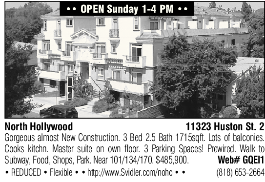North Hollywood 11323 Huston St. 2 Gorgeous almost New Construction. 3 Bed 2.5 Bath 1715sqft. Lots of balconies. Cooks kitchn. Master suite on own floor. 3 Parking Spaces! Prewired. Walk to Subway, Food, Shops, Park. Near 101/134/170. $485,900. Web# GQEI1 • REDUCED • Flexible • • http://www.Svidler.com/noho • • (818) 653-2664