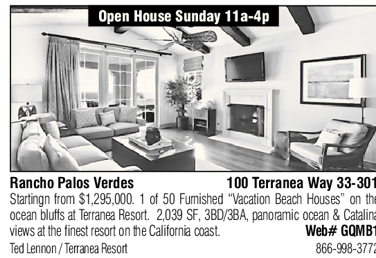 Rancho Palos Verdes 100 Terranea Way 33-301 ocean bluffs at Terranea Resort. 2,039 SF, 3BD/3BA, panoramic ocean & Catalina Startingn from $1,295,000. 1 of 50 Furnished “Vacation Beach Houses” on the views at the finest resort on the California coast. Web# GQMB1 Ted Lennon / Terranea Resort 866-998-3772