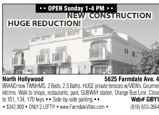 •• OPEN Sunday 1-4 PM •• North Hollywood 5625 Farmdale Ave. 4 BRAND new TWNHMS. 2 Beds. 2.5 Baths. HUGE private terraces w/VIEWs. Gourmet kitchns. Walk to shops, restaurants, park, SUBWAY station, Orange Bus Line. Close to 101, 134, 170 fwys •• Side-by-side parking •• Web# GIBY1 • $342,900 • ONLY 2 LEFT!!! • www.FarmdaleVillas.com • (818) 653-2664