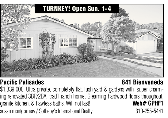 Pacific Palisades 841 Bienveneda $1,339,000. Ultra private, completely flat, lush yard & gardens with super charming renovated 3BR/2BA trad’l ranch home. Gleaming hardwood floors throughout, granite kitchen, & flawless baths. Will not last! Web# GPHF1 susan montgomery / Sotheby’s International Realty 310-255-5441