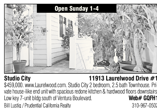 Open Sunday 1-4 Studio City 11913 Laurelwood Drive #1 $459,000. www.Laurelwood.com. Studio City 2 bedroom, 2.5 bath Townhouse. Private house-like end unit with spacious redone kitchen & hardwood floors downstairs. Low key 7-unit bldg south of Ventura Boulevard. Web# GQFH1 Bill Lustig / Prudential California Realty 310-967-0502 See also