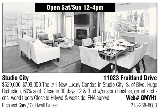 Studio City 11023 Fruitland Drive $529,000-$799,000 The #1 New Luxury Condos in Studio City, S. of Blvd. Huge Reduction, 60% sold, Close in 30 days!!2&3bdw/custom finishes, grmet kitchens, wood floors Close to Hllywd & westside. FHA apprvd Web# GMYH1 Rich and Gary / Coldwell Banker 213-268-8083