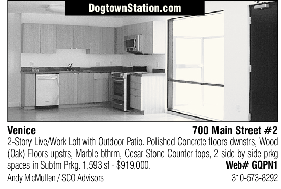 Venice 700 Main Street #2 2-Story Live/Work Loft with Outdoor Patio. Polished Concrete floors dwnstrs, Wood (Oak) Floors upstrs, Marble bthrm, Cesar Stone Counter tops, 2 side by side prkg spaces in Subtrn Prkg. 1,593 sf - $919,000. Web# GQPN1 Andy McMullen / SCO Advisors 310-573-8292