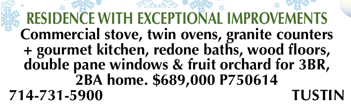 RESIDENCE WITH EXCEPTIONAL IMPROVEMENTS Commercial stove, twin ovens, granite counters + gourmet kitchen, redone baths, wood floors, double pane windows & fruit orchard for 3BR, 2BA home. $689,000 P750614 714-731-5900 TUSTIN