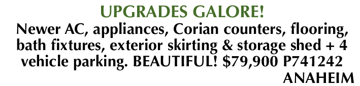 Newer AC, appliances, Corian counters, flooring, bath fixtures, exterior skirting & storage shed + 4 vehicle parking. BEAUTIFUL! $79,900 P741242 ANAHEIM