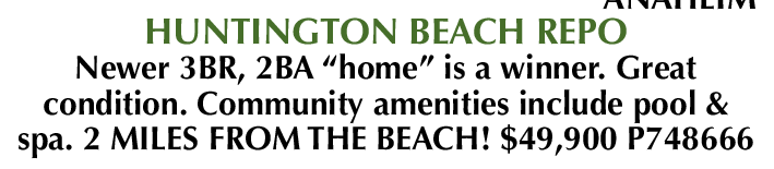 ANAHEIM HUNTINGTON BEACH REPO Newer 3BR, 2BA “home” is a winner. Great condition. Community amenities include pool & spa. 2 MILES FROM THE BEACH! $49,900 P748666
