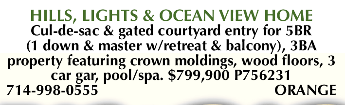 HILLS, LIGHTS & OCEAN VIEW HOME Cul-de-sac & gated courtyard entry for 5BR (1 down & master w/retreat & balcony), 3BA property featuring crown moldings, wood floors, 3 car gar, pool/spa. $799,900 P756231 714-998-0555 ORANGE