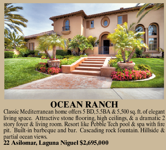 OCEAN RANCH Classic Mediterranean home offers 5 BD, 5.5BA & 5,500 sq. ft. of elegant living space. Attractive stone flooring, high ceilings, & a dramatic 2 story foyer & living room. Resort like Pebble Tech pool & spa with fire pit. Built-in barbeque and bar. Cascading rock fountain. Hillside & partial ocean views. 22 Asilomar, Laguna Niguel $2,695,000