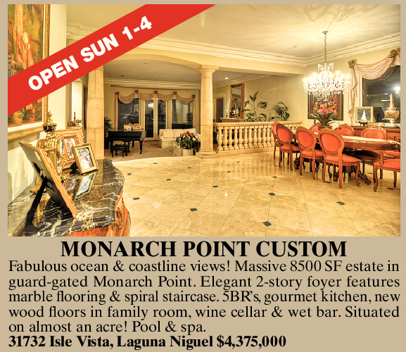 MONARCH POINT CUSTOM Fabulous ocean & coastline views! Massive 8500 SF estate in guard-gated Monarch Point. Elegant 2-story foyer features marble flooring & spiral staircase. 5BR’s, gourmet kitchen, new wood floors in family room, wine cellar & wet bar. Situated on almost an acre! Pool & spa. 31732 Isle Vista, Laguna Niguel $4,375,000